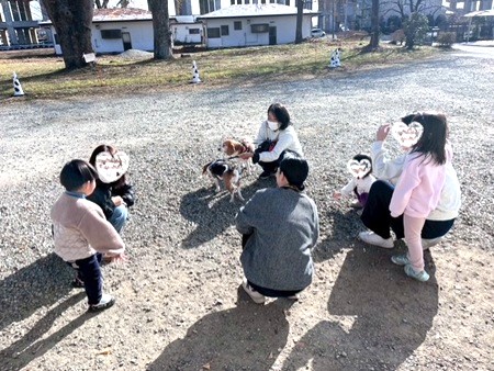 外の広い敷地では、可愛いワンちゃんとのお散歩体験ができます。